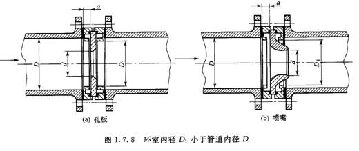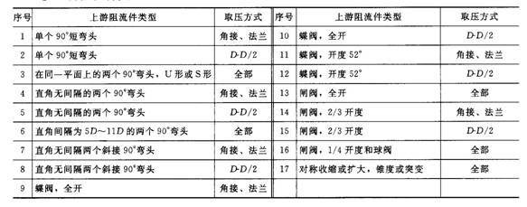 表1.7.5所示為節(jié)流件前后裝設(shè)異徑管。由表可見,在節(jié)流件前裝設(shè)漸擴(kuò)管會(huì)引起很大的測(cè)量誤差,而在節(jié)流件前后裝設(shè)漸縮管,只要漸縮管夾角不大,流出系數(shù)的偏離可小于2%。