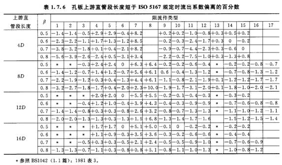 當(dāng)節(jié)流件上游側(cè)直管段長(zhǎng)度不符標(biāo)準(zhǔn)規(guī)定時(shí),流出系數(shù)將發(fā)生變化。表1.7.6及表1.7.7列舉若干流出系數(shù)偏差的估算值及其附加不確定度。
