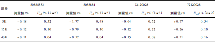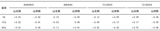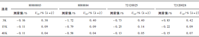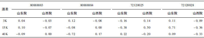(1)熱量相對(duì)示值誤差測(cè)量結(jié)果中,兩院在15K點(diǎn)處與參考值的差值最大,山東院為+0.17K(72120028);山西院為+0.13K(72120025)。由于3K溫差對(duì)相對(duì)誤差來(lái)說(shuō)要求較高,所以差值的擴(kuò)展不確定度也較大,為0.63%~0.81%。