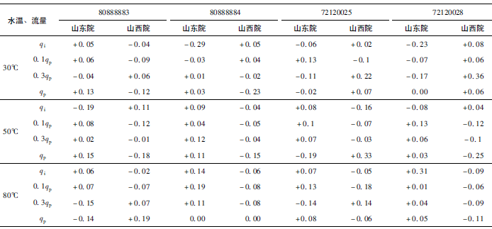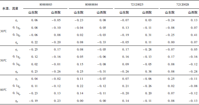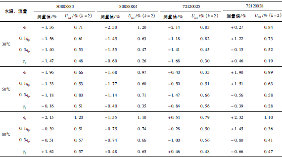 (3)累積體積(標(biāo)準(zhǔn)表法)相對(duì)示值誤差測(cè)量結(jié)果中,山東院在水溫30℃、qi點(diǎn)處與參考值的差值最大,為+0.31%(80888883);山西院在水溫80℃、qp點(diǎn)處與參考值的差值最大,為-0.24%(72120028)。同樣在標(biāo)準(zhǔn)表法中比對(duì)樣品在一些試驗(yàn)點(diǎn)上的測(cè)量重復(fù)性也不是很好,差值的擴(kuò)展不確定度最大達(dá)到了1.41%。