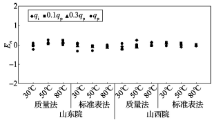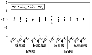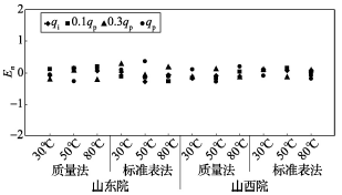 (2)累積體積(質(zhì)量法)相對(duì)示值誤差測(cè)量結(jié)果中,山東院在水溫80℃、qi點(diǎn)處與參考值的差值最大,為+0.31%(72120025);山西院在水溫30℃、0.3qp點(diǎn)處與參考值的差值最大,為+0.36%(72120028)。由于比對(duì)樣品在一些試驗(yàn)點(diǎn)上的測(cè)量重復(fù)性不是很好,差值的擴(kuò)展不確定度最大達(dá)到了1.35%。