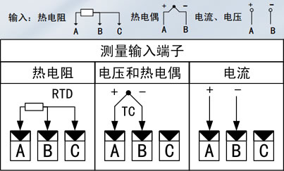 熱電阻:Pt100/Cu100/Cu50/BA1/BA2/G53;引線電阻補償范圍≤50Ω,熱電阻接線時A/B/C三個端子必須都要接上,B/C端子可以短接,C端子數(shù)目不夠時,通道可以共用,接線如上圖所示。