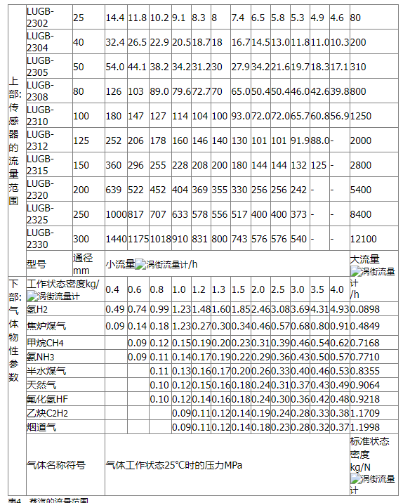 LUGB/E系列渦街流量儀表參比條件下渦街流量傳感器工況流量范圍表