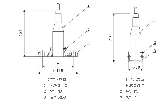 在測量流動性較大的介質(zhì)時(shí),為防止傳感器劇烈擺動,用戶可選用配重附件,以起到穩(wěn)定傳感器的作用。配重以法蘭形式提供(DN50、PN4.0MPa、GB116.7-88),用戶可以用螺栓將其固定于工藝設(shè)施。